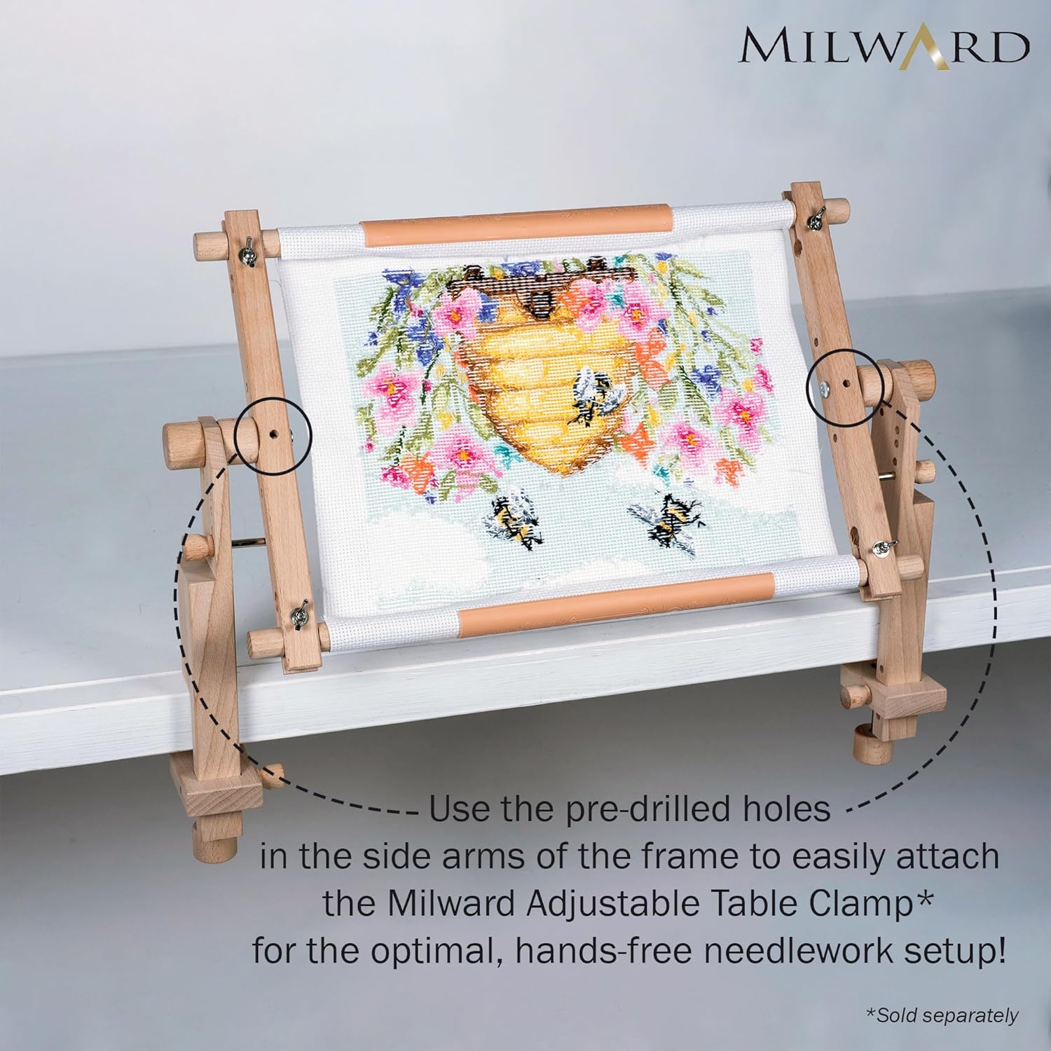 Introducing the Milward Rotating Tapestry Frame - Clip-On, the ultimate tool for all your needlecraft projects. Crafted from premium beech wood, this frame boasts an ultra-smooth finish that prevents fabric snags and feels gentle on your hands. Perfect for a variety of needle crafts, attaching fabric is a breeze with the included plastic clips, which securely hold your work without leaving any marks. Designed for convenience and functionality, the Milward Rotating Tapestry Frame features holes in each of the two vertical arms, allowing easy attachment to the Milward Adjustable Table Clamp for a hands-free setup. The horizontal arms rotate, enabling you to scroll your fabric and maintain a perfectly smooth base for your work. Assembly is simple with the included step-by-step instructions, and when not in use, the frame can be disassembled for effortless and compact storage. Enhance your crafting experience with this versatile and user-friendly tapestry frame. Compatible with the Milward Adjustable Table Clamp for added stability, the Milward Rotating Tapestry Frame - Clip-On is your go-to choice for seamless needlecraft projects.